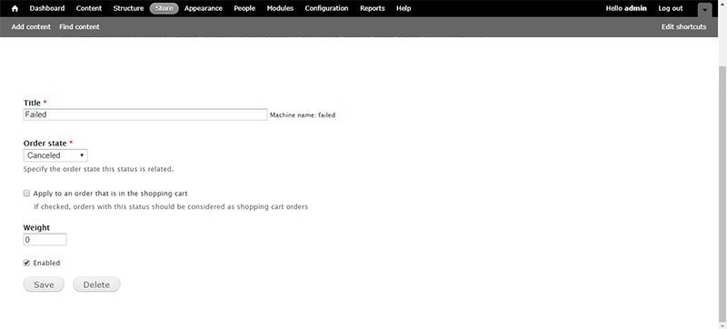 After that, fill the Title as 'Failed', Order State as 'Canceled' and check the enable box and click on save. Use the below screenshot as refence.