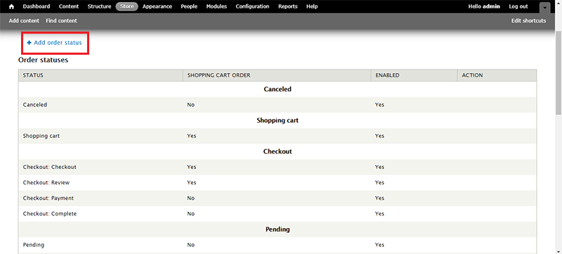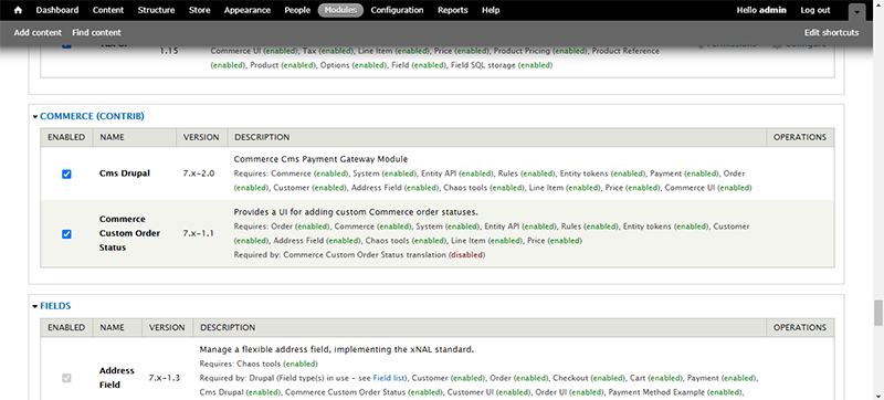Now in Commerce (CONTRIB) section find "cms-drupal" and commerce_custom_order_status and click on the checkbox and Save it.