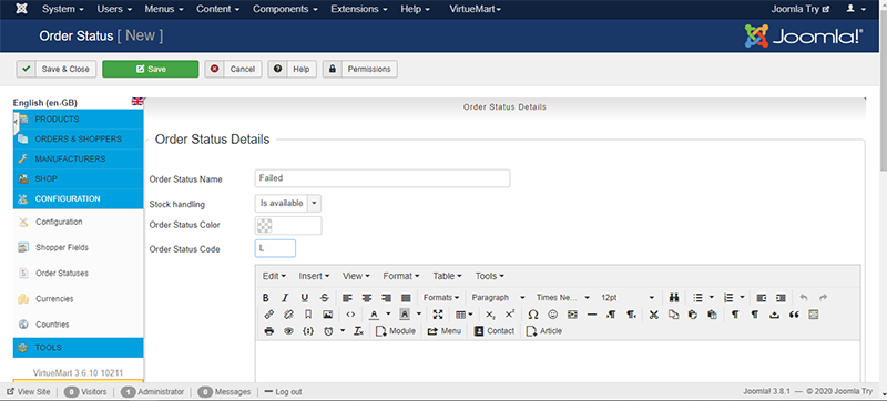 - Goto VirtueMart->Configuration->Order Statuses on left as shown in the figure and click on "new" button