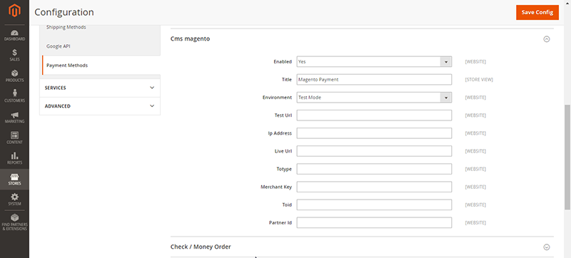 - Go to Admin->Store->Configuration->Sales->Payment Method->Cms magento, fill the details here and save them.