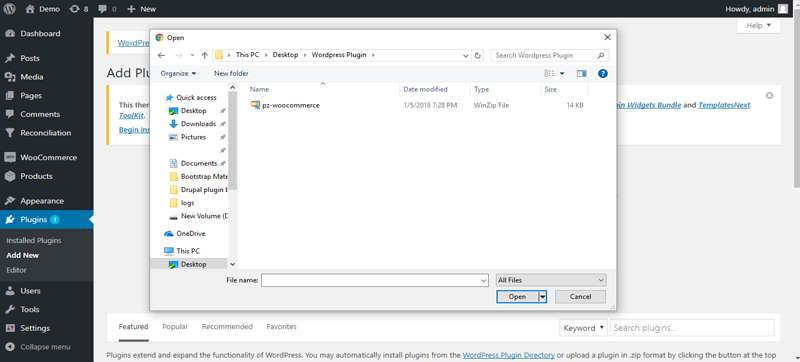 - After clicking on a "Choose File" button, a small search dialog box will be displayed, now search for the zip file (plugin provided by as pz-woocommerce) and the click on "Open".