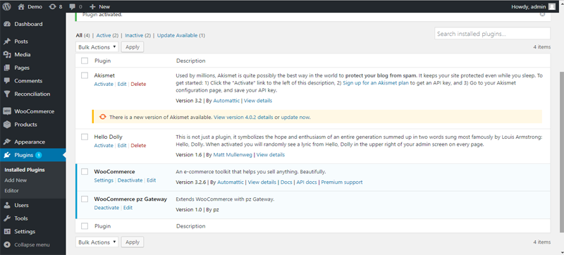 - Congratulation, your plugin has been installed successfully. Please visit your site and you will see "pz-woocommerce" as Payment Method.