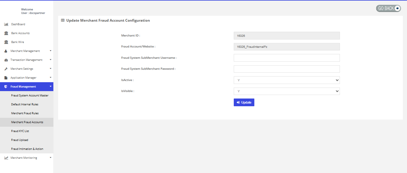 After login you need to click on "Merchant Fraud Accounts" section under "Fraud Management" tab in the left navigation panel of Partner's back office.