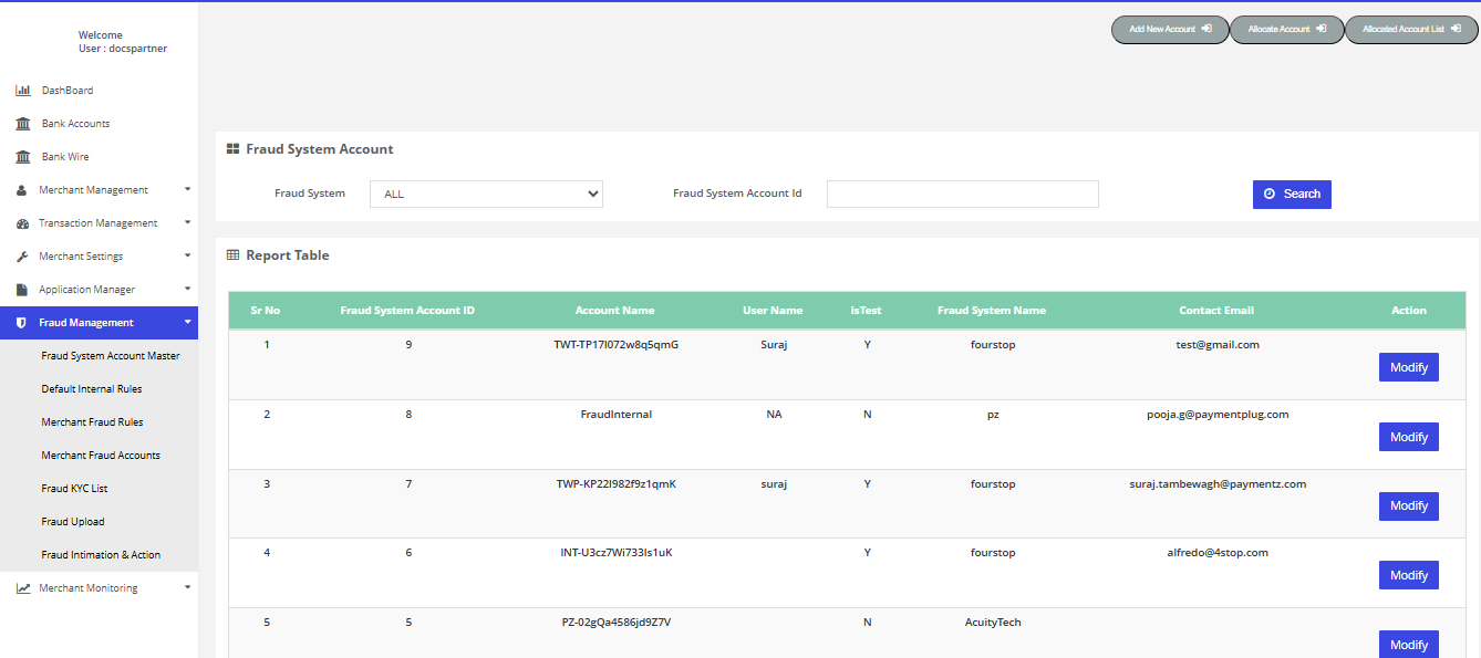 After login you need to click on "Fraud System Account Master" section under "Fraud Management" tab in the left navigation pannel of Partner's back office.