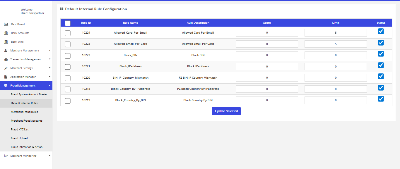 After login you need to click on "Default Internal Rules" section under "Fraud Management" tab in the left navigation panel of Partner's back office.