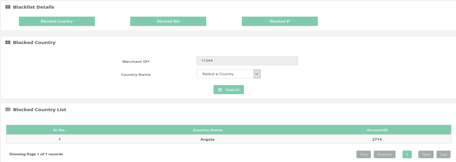 After login you need to click on "Blacklist Details" section under "Merchant Settings" tab in the left navigation panel of Merchant's back office. On the resulting page click on "Blocked Country" button.