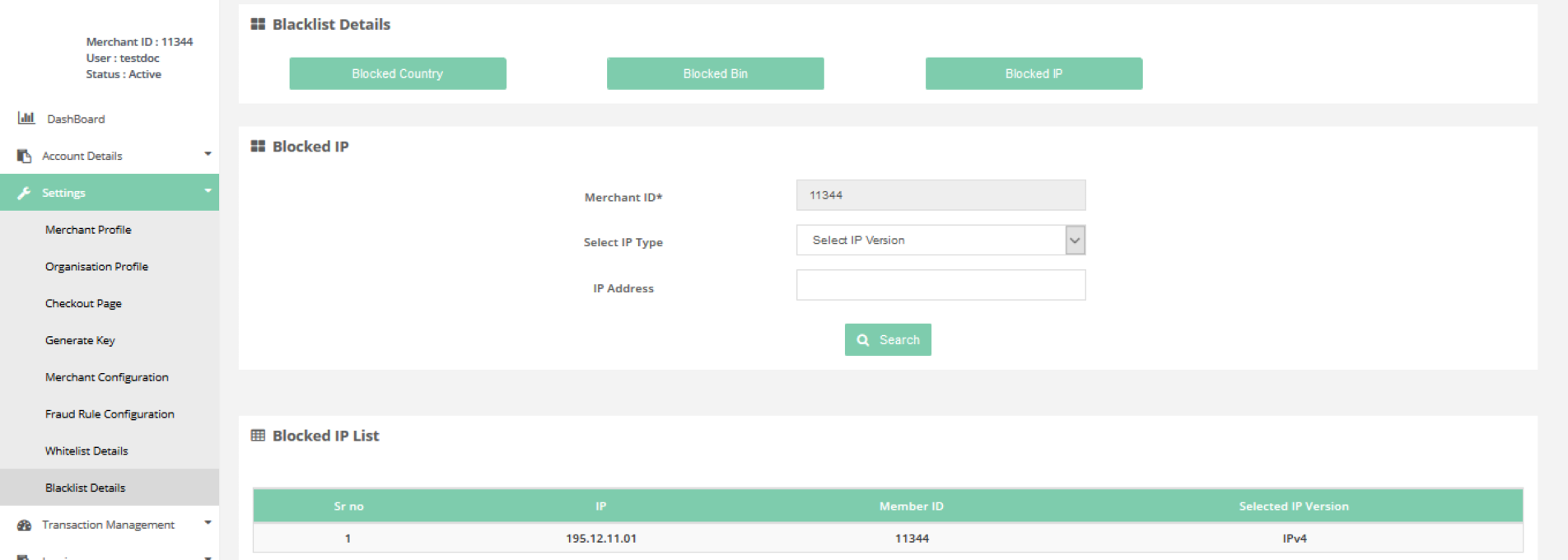 After login you need to click on "Blacklist Details" section under "Merchant Settings" tab in the left navigation panel of Merchant's back office. On the resulting page click on Blocked IP button.