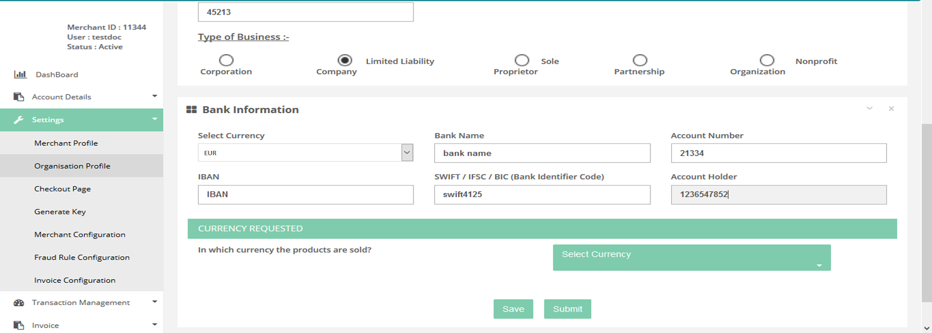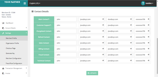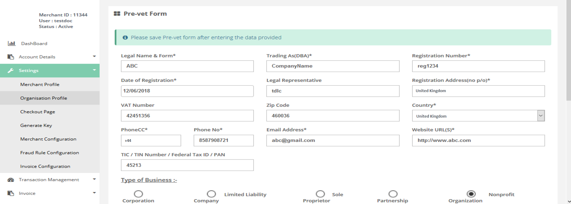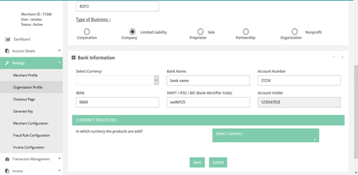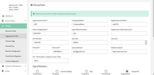 After login you need to click on Organisation Profile section under Settings tab in the left navigation bar of Merchant’s back office.