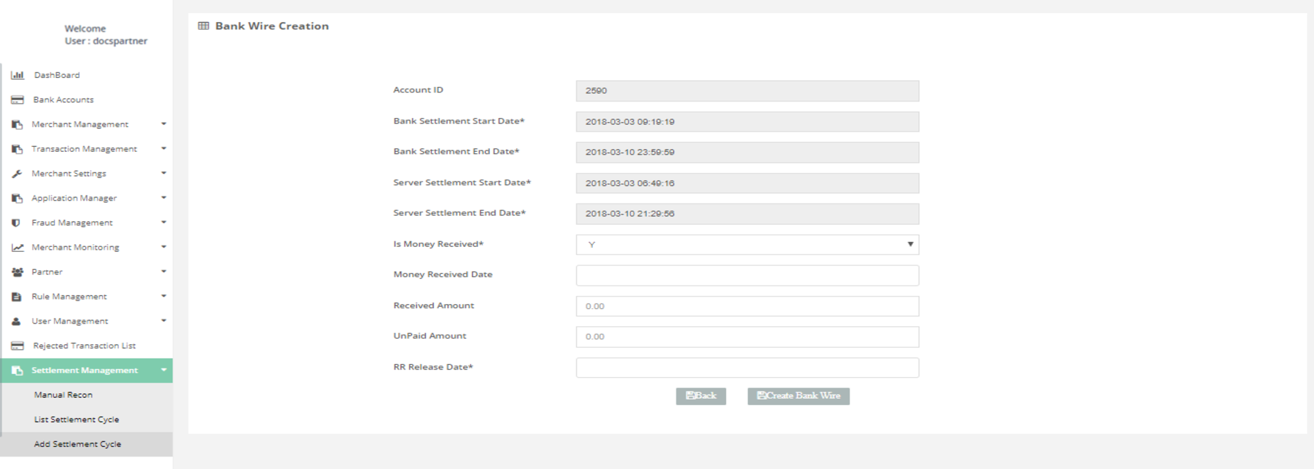 After login, you need to click on “Add Settlement Cycle" section under " Settlement Management" tab in the left navigation panel of Partner's back office.