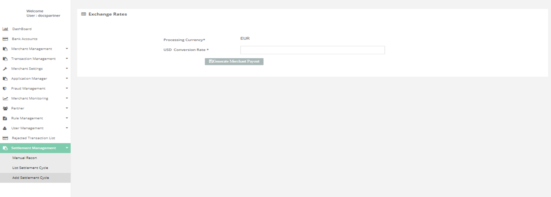 On this page, the Processing Currency is displayed. Provide the Conversion rates from Processing Currency to Settlement Currency and click on “Generate Merchant Payout”.