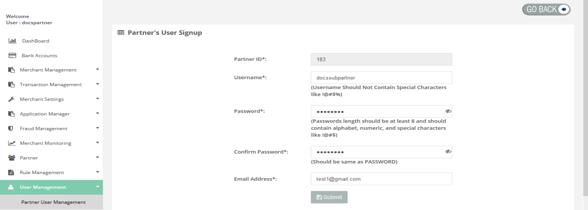 After Login, you need to click on the "Partner User Management" section under "User Management" tab in the left navigation panel of Partner's back office and then you need to click on "Add New User" button which is situated at rightmost top of the search filter.
