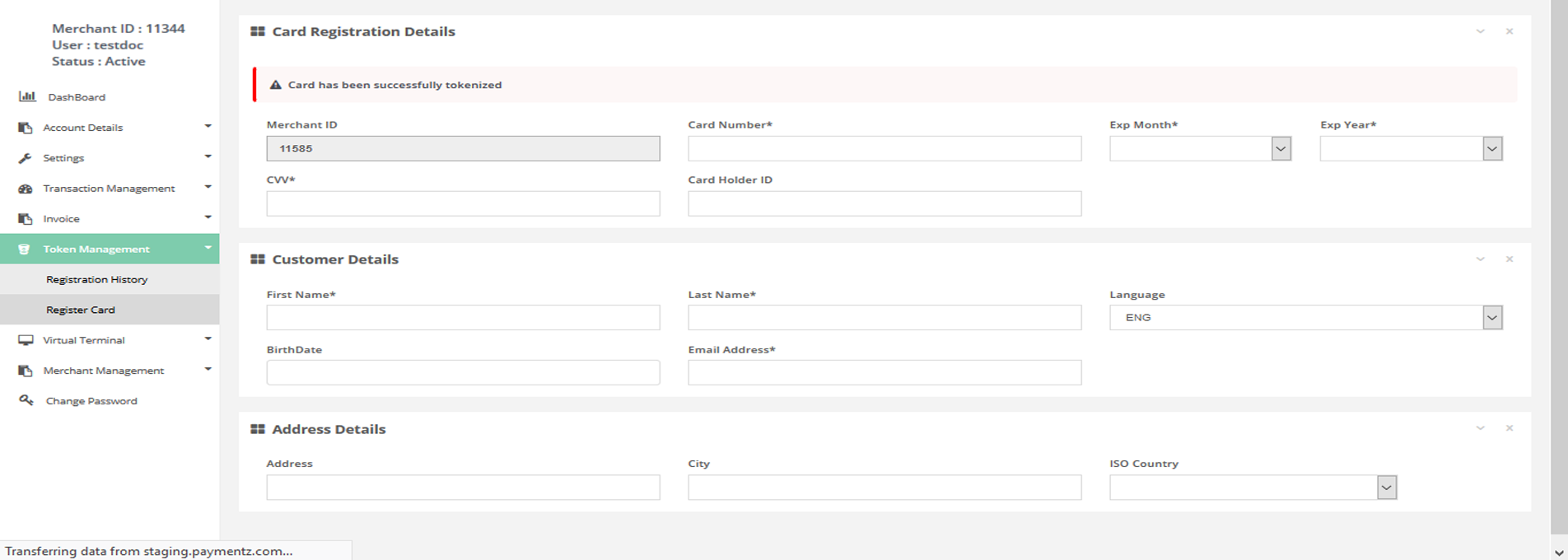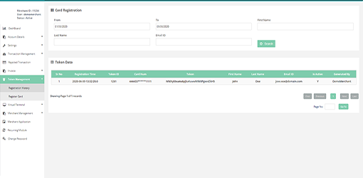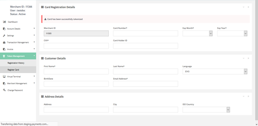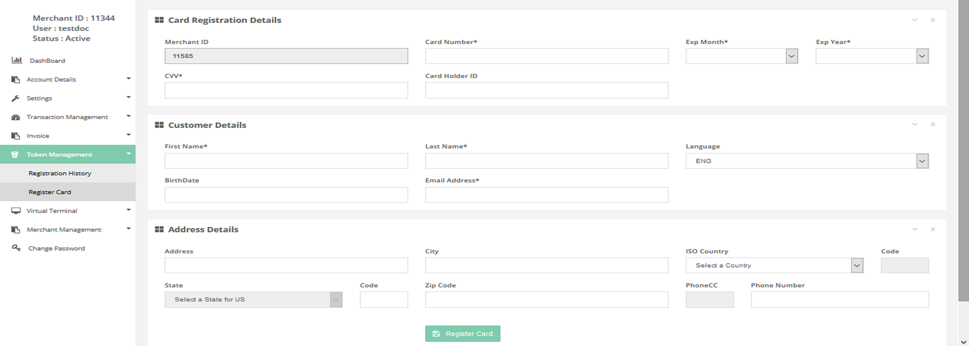 After Login you need to click on "Register Card" tab under "Token Management" section in the left navigation pannel of Merchant’s back office.