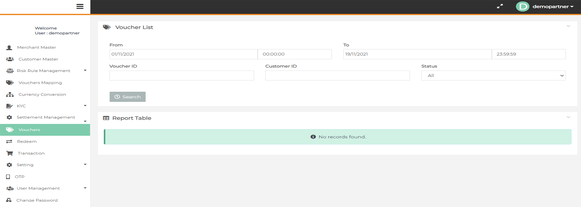 - After login you need to click on "Voucher" tab in the left navigation panel of Partner's back office.
